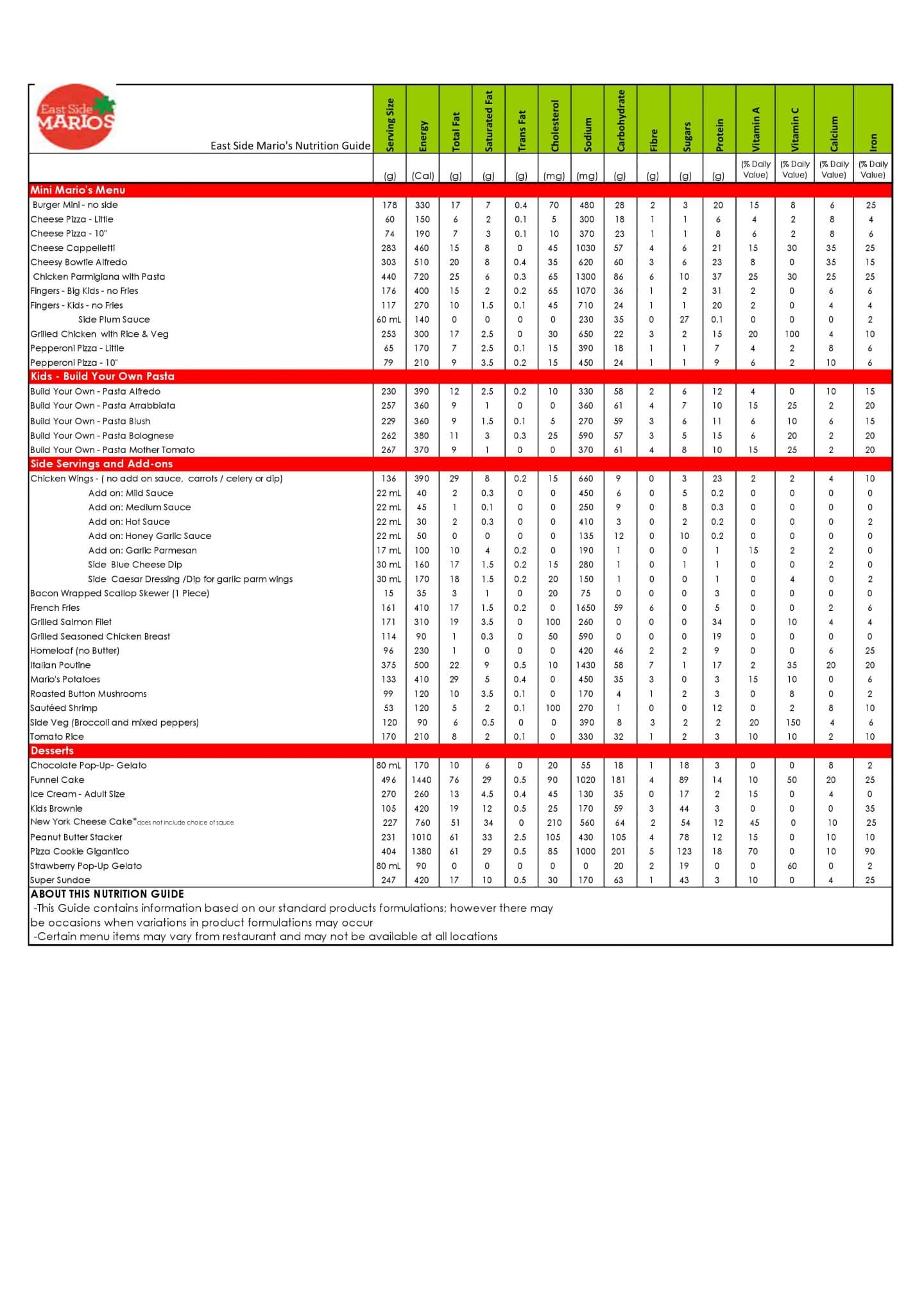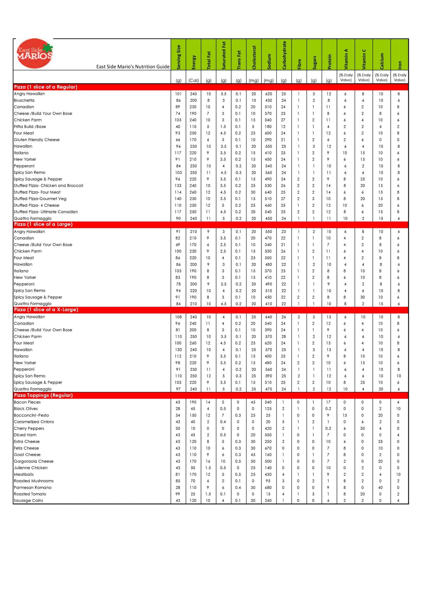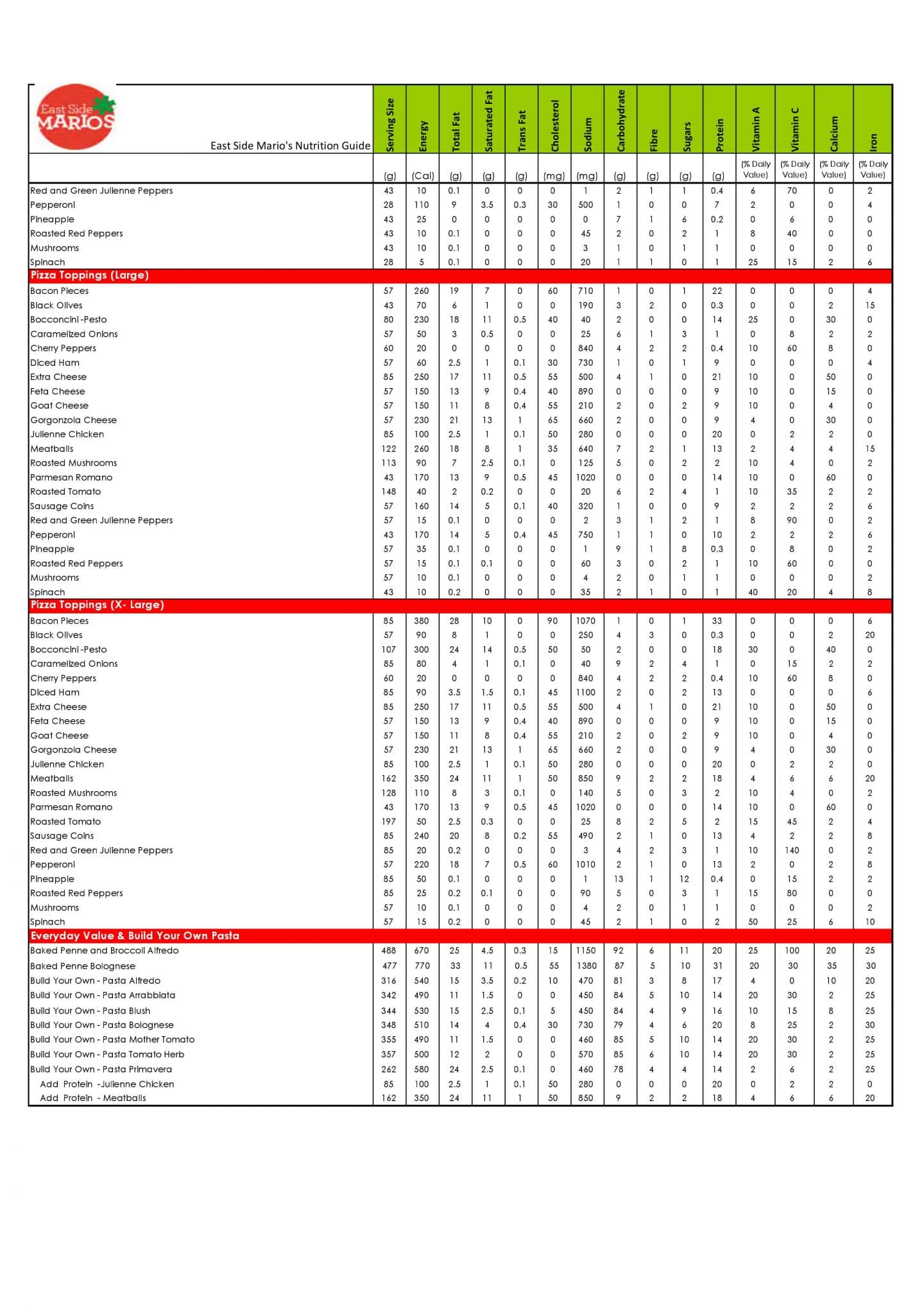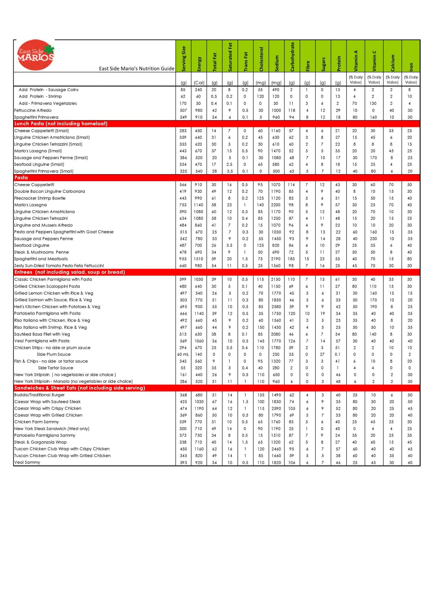 Check East Side Mario’s Canada Menu, and Pasta & Pizza Nutrition Facts & Calories. Don’t miss the East Side Mario’s Restaurants specials, Secret Menu offers, and the Lunch promotions & specials.